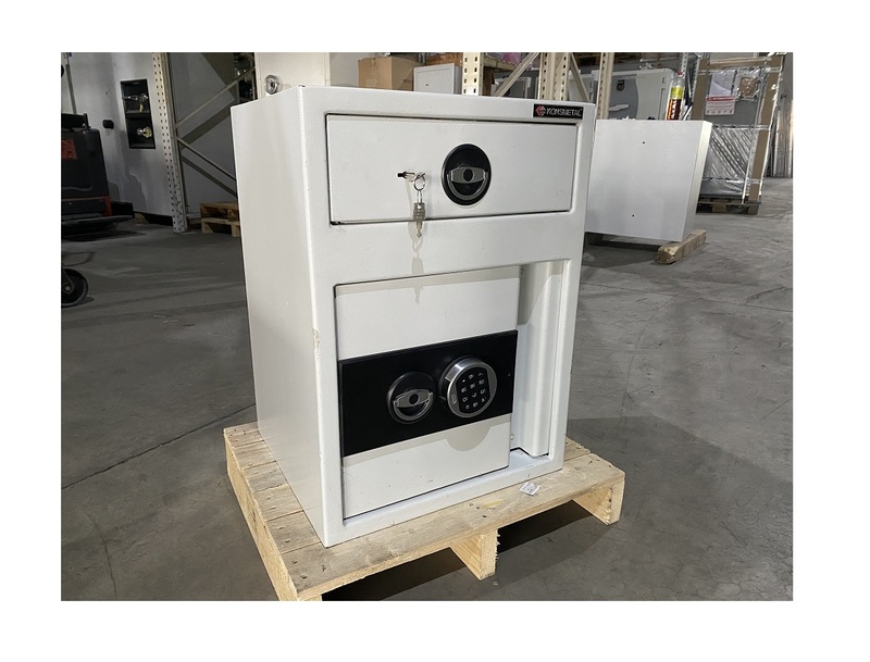 Újszerű állapotú, bedobónyílásos fiókkal rendelkező, nappali értéktároló eszköz, mely kialakításnál fogva biztonságossá teszi a nagy pénzforgalmú pénztárak készpénzkezelését. Méreteinél fogva pult alá helyezhető, így közvetlenül a pénztári munkahely mellé helyezhető. MABISZ által minősített. A fotó csak illusztráció, a szekrény esztétikai állapota eltérhet. Műszaki adatok: MABISZ E kategória Biztosítási értékhatára 8 millió, mely riasztóba kötve 16 millió Forint Ajtó és trezortest duplafalú A szerkezetileg egységes kialakítású páncélszekrény két részből áll: 1 db zárható, kihúzható fiók Alsó páncélszekrény Méretek: 670*485*435 mm a teljes korpusz 130*420 mm a fiók 290 mm-re jön ki a korpuszból a fiók teljesen kihúzva 100*335*195 mm a fiók tároló rész mérete 100*320*45 mm a bedobónyílás mérete 225*390*260 mm a páncélszekrény mérete Zárszerkezet: Fiókok: kulcsos zár, két darab kulccsal Alsó páncélszekrény: 1 db Lagard 39e Elektronikus számkombinációs zár Alsó páncélszekrény részen 30 mm-es csapok biztosítják a zárást, melyek 3+1 irányban zárnak Szín: világosszürke RAL 7035. Rögzítő furat lefelé Furat riasztókábel bevezetéshez.