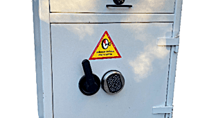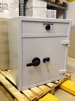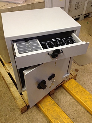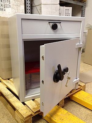 Használt szuperkassza SK 1 E Műszaki adatok: MABISZ E kategória Biztosítási értékhatára 8 millió, mely riasztóba kötve 16 millió Forint Ajtó és trezortest duplafalú A szerkezetileg egységes kialakítású páncélszekrény két részből áll: Kihúzható fiók Alsó páncélszekrény Zárszerkezet: Fiók: kulcsos zár, két darab kulccsal Alsó páncélszekrény: 1 db Lagard 39e Elektronikus számkombinációs zár Szín: világosszürke RAL 7035. Rögzítő furat lefelé Furat riasztókábel bevezetéshez. Orientáció: álló Magasság - külső: 700 mm Szélesség - külső: 600 mm Mélység - külső: 445 mm Súly: 137 kg Zárócsapok száma: 5 db